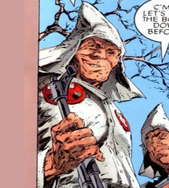 A member of the KKK introduced in Spawn Issue #30. He, along with Johnny are instructed to retrieve the corpse of linched Spawn in the morning. When they come back in the morning, Spawn is there waiting, and brutally beats them. Peter is one of the klansmen that appear in court against Brad Armstrong - and being precided by Judge Zachery Missen.
