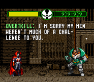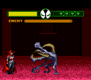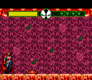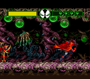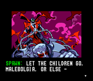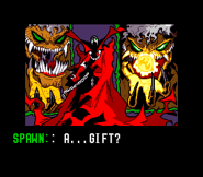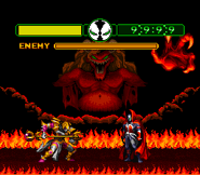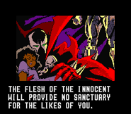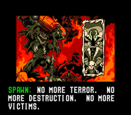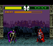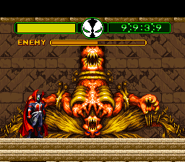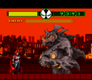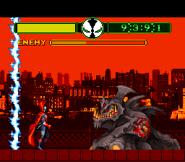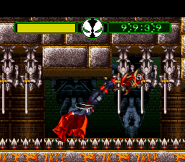 Todd McFarlane's Spawn: The Video Game is a tractional side-scrolling beat 'em up with some platforming elements. The player controls the Al Simmons Hellspawn in his K7-Leetha, who can walk, run, duck and jump throughout the seventeen levels of the game. In combat, Simmons can punch and kick in order to attack enemies. In addition to the melee attacks available, the main character has access to an arsenal of special powers that requires the input of a special button combination on the controller. Using a special power will drain his life force meter, and different special powers use different amounts of energy. Several of Simmons' special powers will fire projectiles, but the main character can also teleport as well as use a special power that completely refills his life force meter. Also, the main character's health can be replenished by collecting a special item dropped by one of the "end-of-level bosses" when defeated. The game is over when the life meter is fully depleted, or the in-game timer runs out.